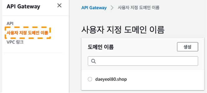 - API Gateway 콘솔에서 사용자 지정 도메인 이름 메뉴를 선택한 후 생성한 사용자 지정 도메인 이름을 선택합니다.