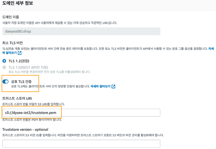 - Customer Domain Name(사용자 지정 도메인) 설정 화면에서 도메인 이름과 최소 TLS 버전을 선택하고, 양방향(상호) TLS 인증을 활성화합니다. 여기서 트러스트 스토어 URI는 Private CA를 저장한 S3 위치를 지정합니다.