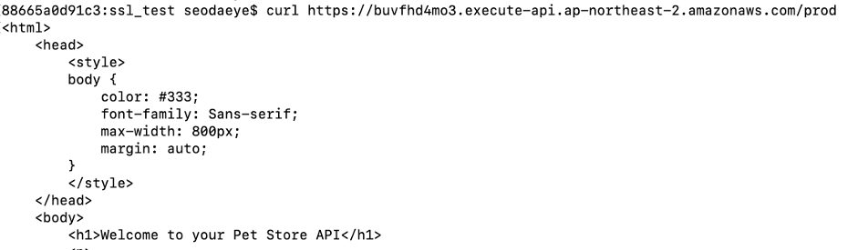 Server Contents 구성을 위해 Amazon API Gateway에서 기본 예제로 제공되는 API PetStore 예제를 사용해 배포합니다. 해당 API는 Custom Domain Name 뒤 편에서 동작하게 되고 Custom Domain Name에서 양방향 인증이 성공하면 해당 API가 호출되어 양방향 인증 동작을 확인할 수 있습니다.