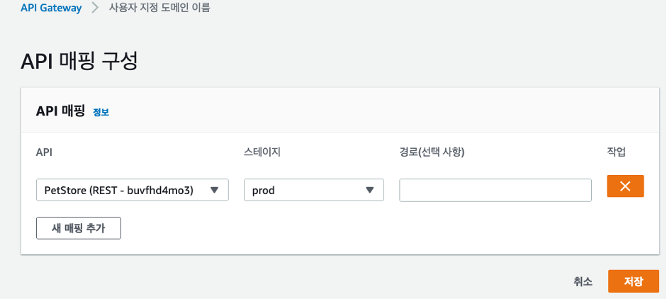 - Amazon API Gateway 사용자 지정 도메인 이름 생성이 완료되면 API 매핑을 구성해서 PetStore와 연결시킵니다.