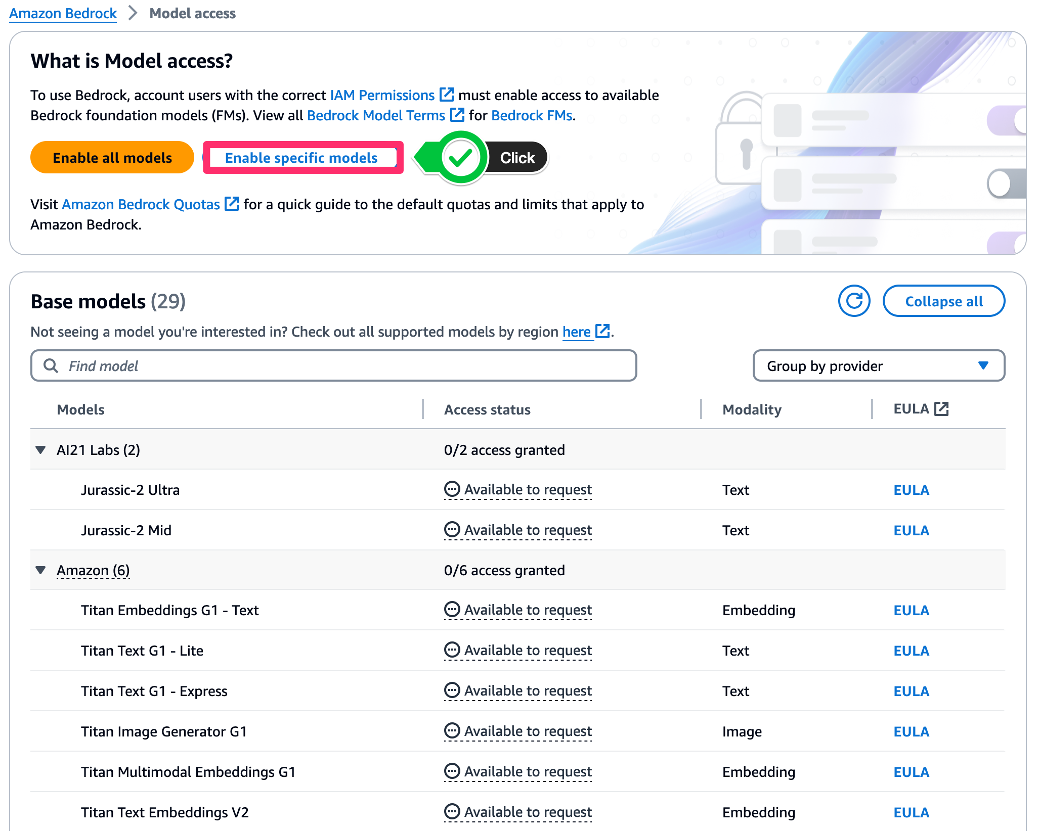 아래와 같이 Model access 페이지에서 ‘Enable specific models’를 클릭합니다.
