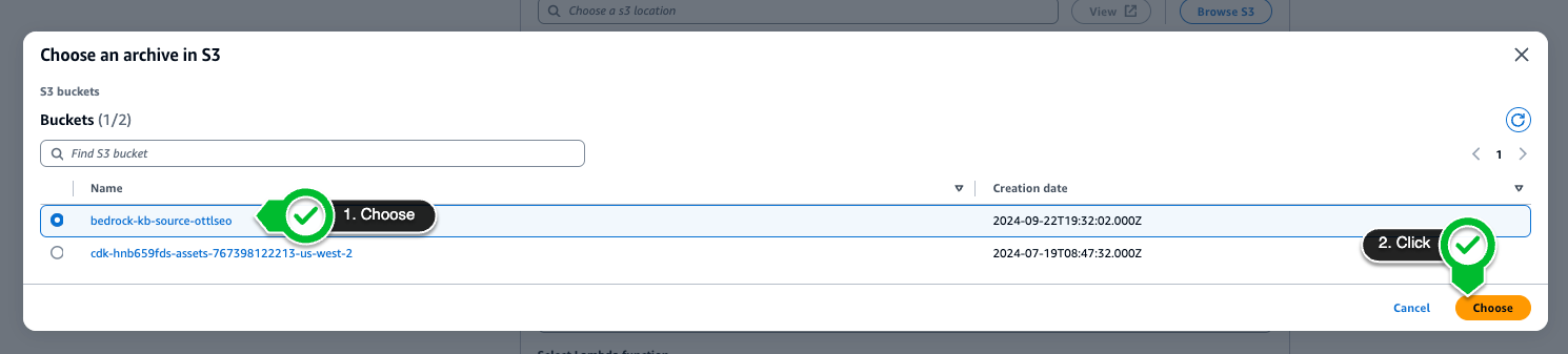 다음은 Knowledge base의 Data source를 설정하는 단계입니다. ‘Browse S3’ 버튼을 클릭하고, 앞서 [Step 1]에서 생성했던 버킷을 선택해줍니다.