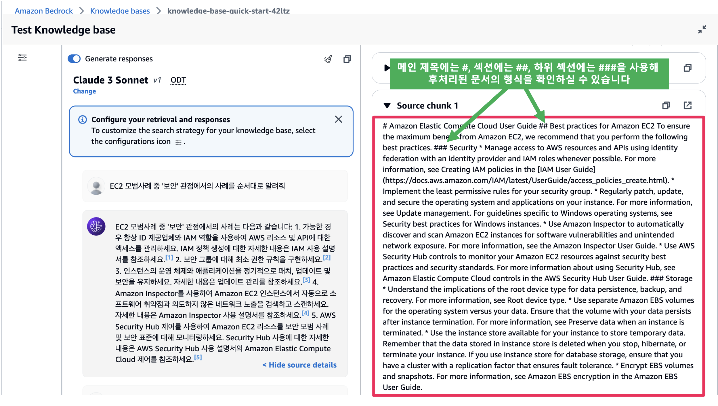 앞서 S3 소스 버킷에 올렸던 EC2 user guide PDF에서 17페이지에 있는 ‘EC2 보안 모범사례’에 대해 질의하기 위해 아래 질문을 입력해보겠습니다.