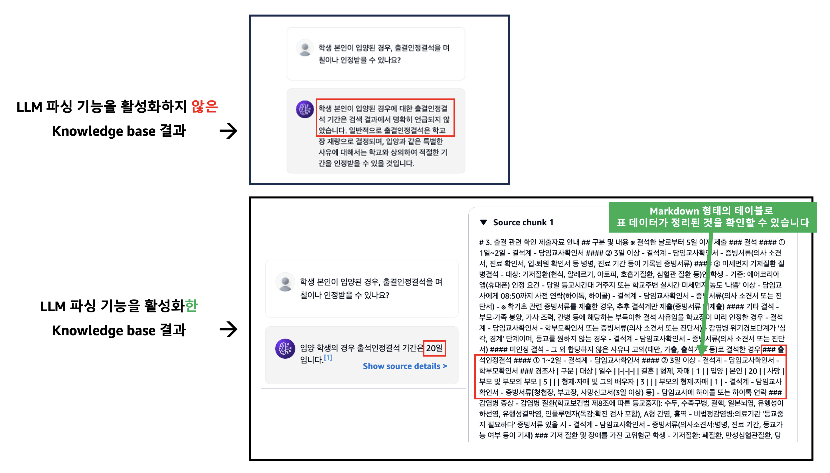아래는 LLM 파싱 기능을 활성화하지 않은 Knowledge base와, 해당 기능을 활성화한 Knowledge base에서 각각 검색한 결과입니다. 해당 기능을 활성화하지 않았던 Knowledge base에서는 “검색 결과에서 명확히 언급되지 않았습니다.”라는 답변이 나온 반면, 해당 기능을 활성화한 Knowledge base에서는 ‘20일’이라는 명확하고 올바른 정보를 찾아 답변하고 있습니다. 답변을 가져온 Source chunk를 확인해보면, 원본 문서에 있던 표 형태의 데이터가 LLM에 의해 Markdown 형태로 후처리되어 인덱싱되었고, 관련 내용 검색 시 이 내용이 검색된 것을 확인하실 수 있습니다.