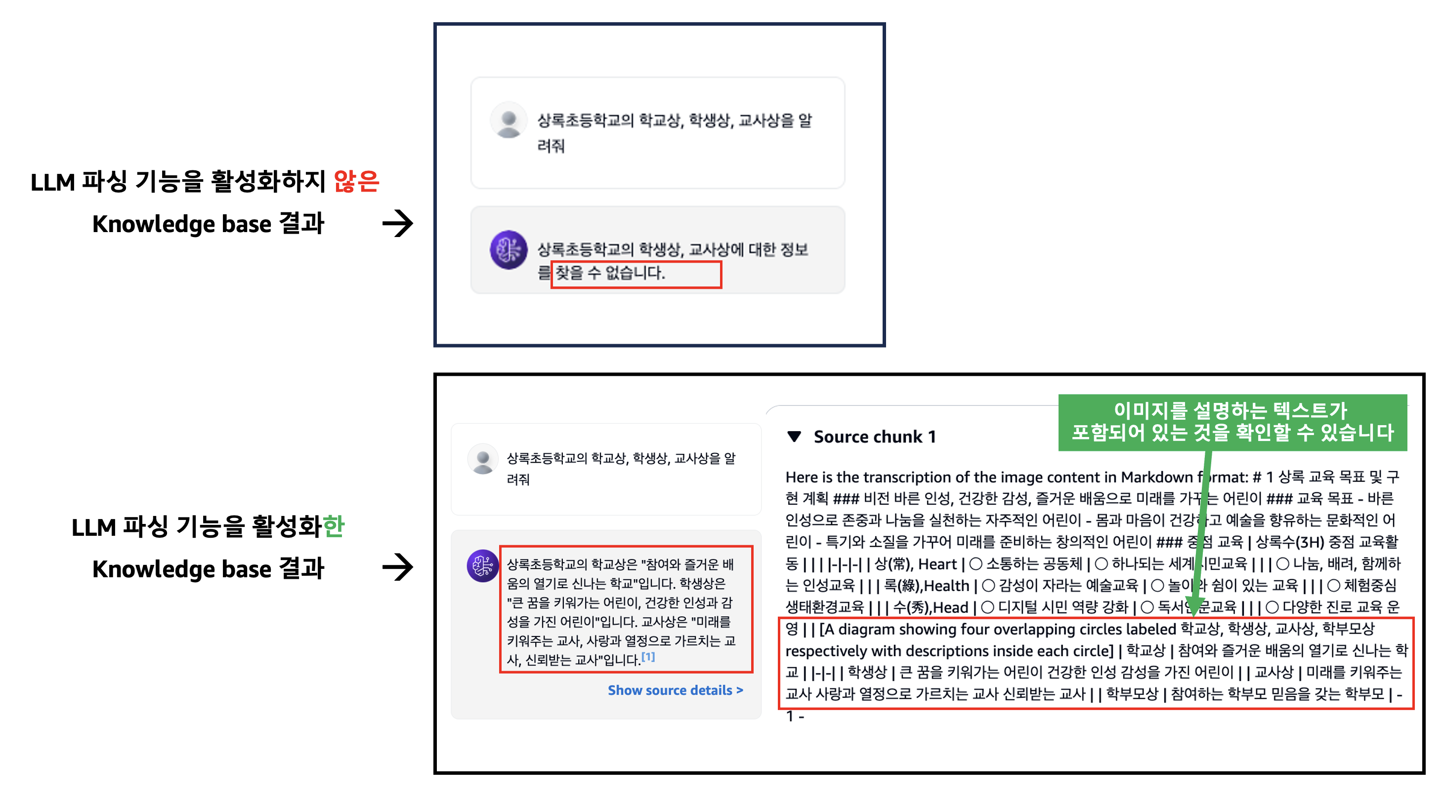 같은 방식으로, 아래는 LLM 파싱 기능을 활성화하지 않은 Knowledge base와 해당 기능을 활성화한 Knowledge base에서 각각 검색한 결과입니다. 해당 기능을 활성화하지 않았던 Knowledge base에서는 “상록초등학교의 학생상, 교사상에 대한 정보를 찾을 수 없습니다.”라는 답변이 나온 반면, 해당 기능을 활성화한 Knowledge base에서는 올바른 정보를 찾아 답변하고 있습니다. 답변을 가져온 Source chunk를 확인해보면, LLM에 의해 이미지에 대한 설명이 작성되었고 이 내용이 검색된 것을 확인하실 수 있습니다.