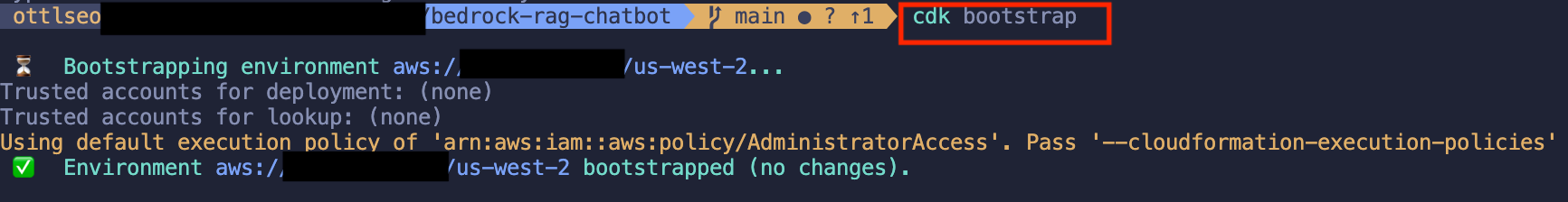 $ cdk bootstrap aws://<Account ID>/us-west-2