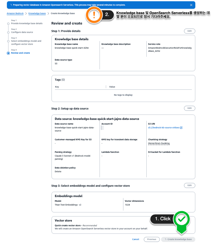 Vector database로는 ‘Quick create a new vector store’ 옵션을 선택해 OpenSearch Serverless를 새로 생성해줍니다. 이후 ‘Next (다음)’ 버튼을 눌러 검토 단계로 이동하고, 검토 후 ‘Create knowledge base’ 버튼을 클릭해 Knowledge base를 생성합니다. 설정한 내용대로 Knowledge base를 구성하고 OpenSearch Serverless를 생성하는 데에 수 분이 소요됩니다.
