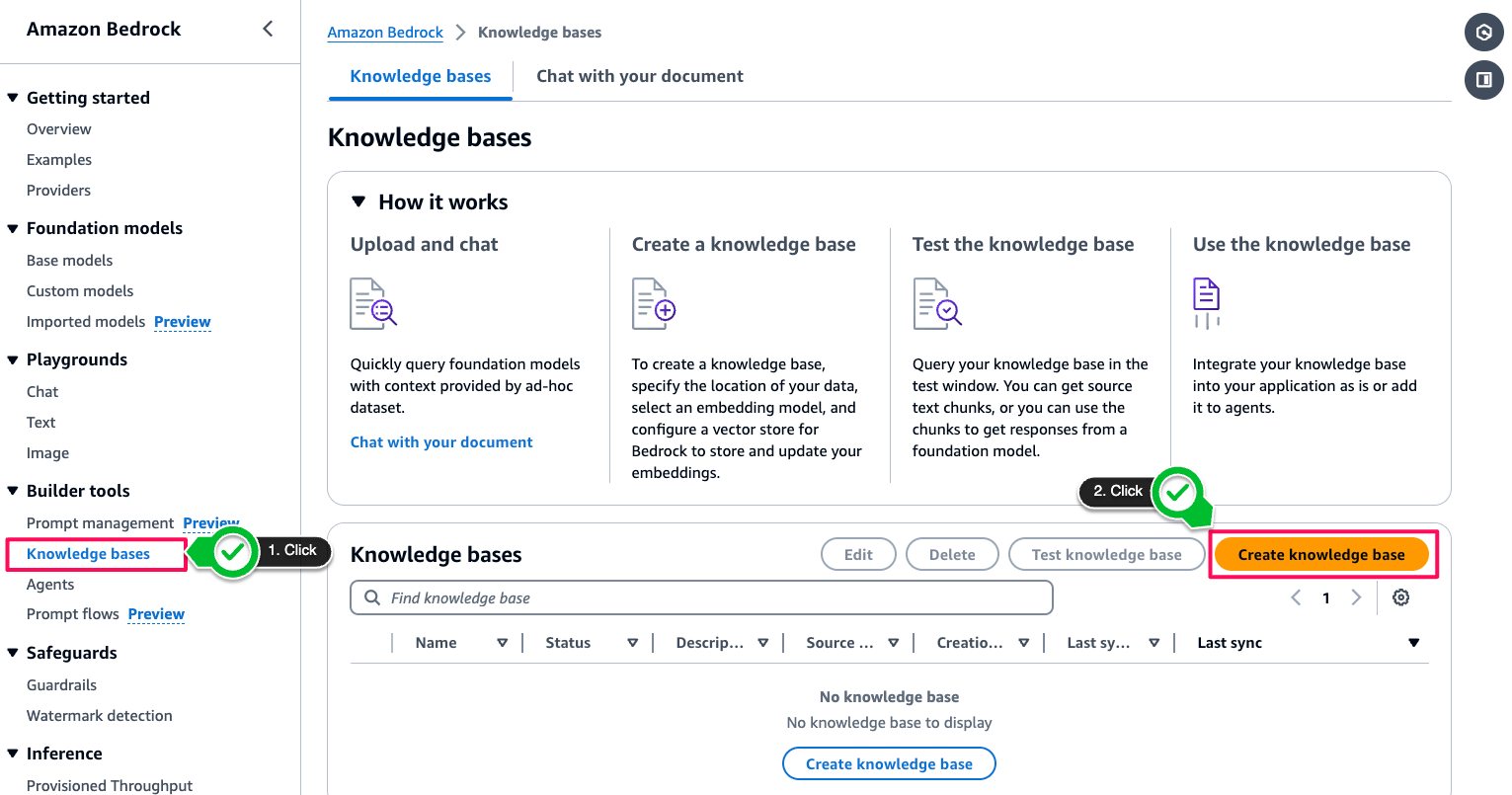 이제 Bedrock Knowledge base를 생성할 준비가 되었습니다. Bedrock Console의 좌측 사이드바에서 Knowledge bases (지식 기반)을 클릭해 생성 화면에 접속하고, ‘Create knowledge base’ 버튼을 클릭합니다.