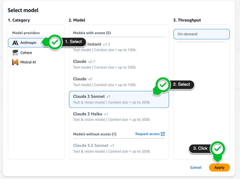 아래와 같은 창이 나타나면, Anthropic의 Claude 3 Sonnet 모델을 선택하고, ‘Apply’ 버튼을 눌러 설정을 완료해줍니다.