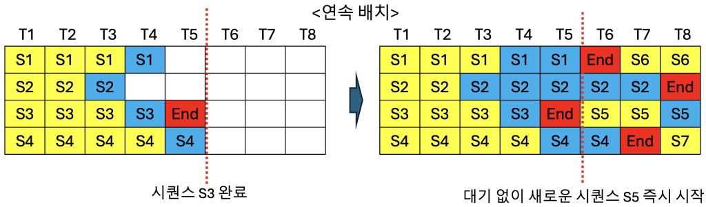 아래 그림을 통해서 정적 배치 처리와 연속 배치 처리의 차이점을 좀 더 설명드리겠습니다. GPU에서 한번에 동시 처리할 수 있는 시퀀스(프롬프트 요청)의 수가 배치 크기입니다. 여기에서는 배치 크기를 4로 가정하였습니다. 노란색은 프리필 단계의 토큰이고, 파란색은 디코드 단계의 토큰을 의미합니다. 위의 정적 배치 그림을 보면, 시간축 T1부터 T5까지 4개의 시퀀스(S1, S2, S3, S4)가 처리됩니다. T5 시점에서 시퀀스 S3은 End 토큰으로 완료되었지만, 배치 내의 다른 시퀀스 S1, S2, S4가 아직 완료되지 않았습니다. 정적 배치 방식에서는 배치 내 모든 시퀀스가 완료될 때까지 기다려야 하므로, S3이 완료된 후에도 S1, S2, S4가 모두 End에 도달하기까지 새로운 시퀀스를 받아들일 수 없습니다. 오른쪽 그림을 보면 T6, T7, T8 시점에 빈 슬롯이 발생하면서 GPU 자원이 낭비되는 것을 확인할 수 있습니다. 동일 배치 내의 시퀀스 4개의 길이, 즉 토큰 수가 모두 같으면 문제가 없겠지만 현실적으로는 다르기 때문에 정적 배치에서 GPU 자원 낭비는 필연적입니다. 반면 아래의 연속 배치 그림에서는 동일하게 T5 시점에서 S3 시퀀스가 End 토큰으로 완료되지만, 즉시 새로운 시퀀스 S5가 배치에 추가되어 T6부터 처리가 시작됩니다. T6 시점에서는 S1이 완료되어 새로운 시퀀스 S6이 추가되고, T7에서 S4가 완료되면서 S7이 즉시 투입됩니다. 이처럼 연속 배치 방식은 각 시퀀스가 완료되는 즉시 대기 중인 새로운 시퀀스로 해당 슬롯을 채울 수 있어, GPU 자원의 활용도를 높일 수 있습니다.