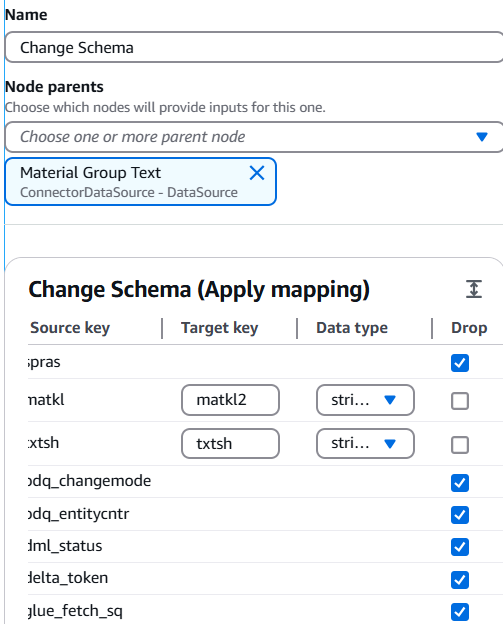 ChangeSchema_node1730875214894 = ApplyMapping.apply(frame=MaterialGroupText_node1730874412841, mappings=[("matkl", "string", "matkl2", "string"), ("txtsh", "string", "txtsh", "string")], transformation_ctx="ChangeSchema_node1730875214894")