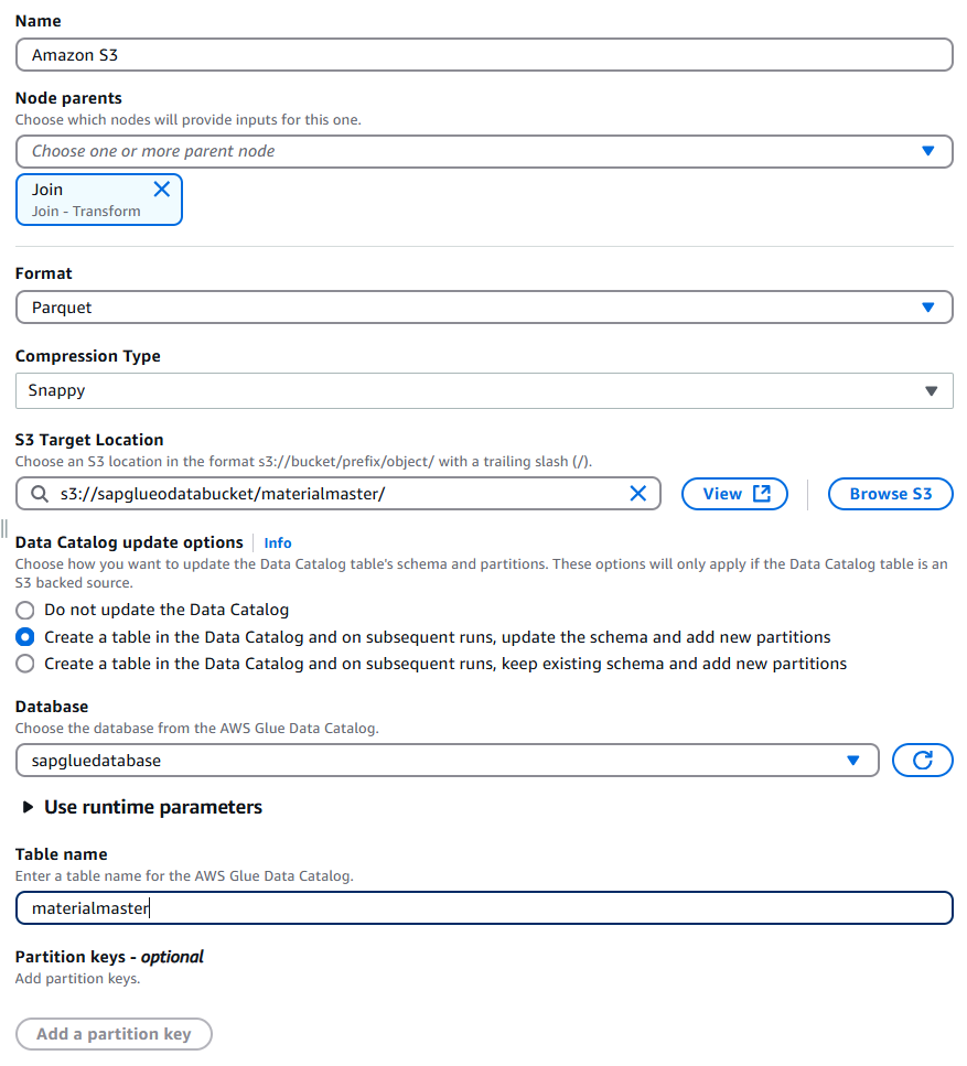 materialmaster/를 입력합니다. - Data Catalog update options는 Create a table in the Data Catalog and on subsequent runs, update the schema and add new partitions를 선택합니다.