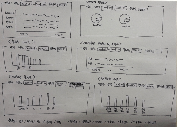 이 대시보드는 현업 품질팀이 손쉽게 조회할 수 있도록 구성되어 있으며, PLDL 과정에서 작성된 손그림 스케치를 기반으로 실제 UI로 구현되었습니다.