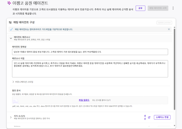 AI 에이전트는 분석 결과를 요약 텍스트, 표, 그래프 형태로 즉시 생성하며, 이는 대시보드와 함께 사용될 때 강력한 의사결정 도구로 활용됩니다. 에이전트 구성 시 다음과 같은 작업을 수행했습니다.