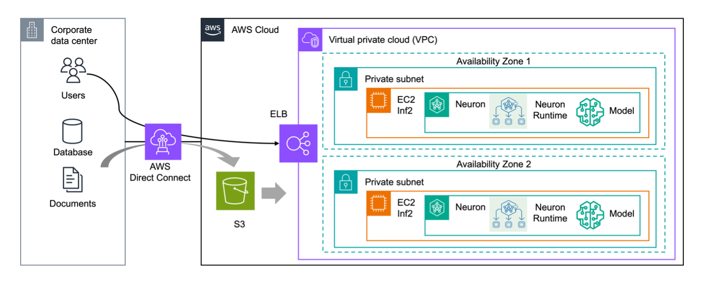 - AWS Neuron 기반의 AWS Inferentia2 EC2: AWS Inferentia2 EC2를 위에서 구성한 Private subnet에 구성할 수 있습니다. 이를 통해서 고객사 데이터센터와 private 통신으로 머신러닝 추론 아키텍처를 구성할 수 있습니다.
