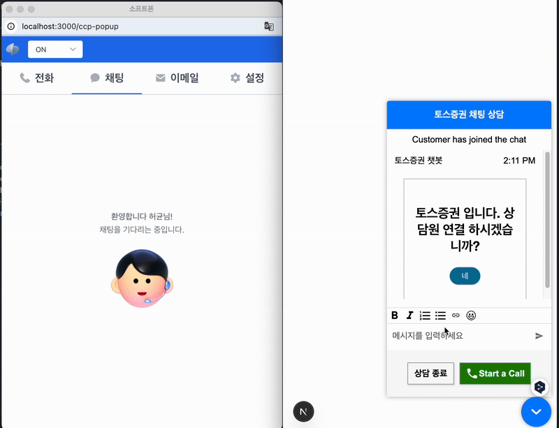 이렇게 제공된 API와 문서를 바탕으로, 토스증권에 맞는 고객 센터 상담 애플리케이션을 구성할 수 있었습니다. 단순히 새로운 기능의 도입을 넘어, 기존 토스증권 고객센터와 호환되도록 브라우저 기반으로 오픈소스 및 기술 표준을 활용하여 개발된 만큼 토스증권 내 프론트엔드 개발자 누구나 소프트폰 기능을 수정하거나 확장할 수 있는 구조로 완성하였습니다.