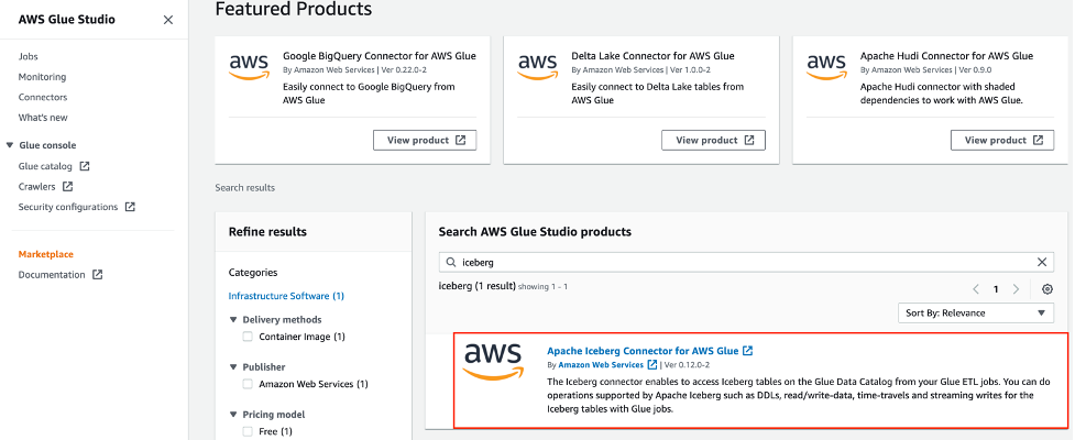 AWS Glue Studio Console의 Marketplace로 이동하여, “Apache Iceberg Connector for AWS Glue”를 검색하고, 검색된 링크를 클릭합니다. (바로가기 링크는 여기입니다.)