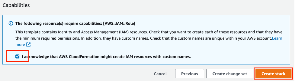 - “I acknowledge that …”을 체크하고, “Create Stack” 버튼을 선택합니다.