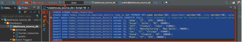 create schema human_resources; create table human_resources.employee_details (emp_no int PRIMARY KEY,name varchar(30), department varchar(30), city varchar(50), salary int); alter table human_resources.employee_details REPLICA IDENTITY FULL; --This statement is required for Aurora postgres to replicate deleted records through AWS DMS insert into human_resources.employee_details values (1, 'Adam', 'IT', 'SFO', 50000); insert into human_resources.employee_details values (2, 'Susan', 'Sales', 'NY', 60000); insert into human_resources.employee_details values (3, 'Jeff', 'Finance', 'Tokyo', 55000); insert into human_resources.employee_details values (4, 'Bill', 'Manufacturing', 'New Delhi', 70000); insert into human_resources.employee_details values (5, 'Joe', 'IT', 'Chicago', 45000); insert into human_resources.employee_details values (6, 'Steve', 'Finance', 'NY', 60000); insert into human_resources.employee_details values (7, 'Mike', 'IT', 'SFO', 60000); commit;위 SQL 스크립트에서 “REPLICA IDENTITY FULL”은 PostgreSQL DB에서 변경되는 모든 레코드를 AWS DMS가 복제하기 위해 필요합니다.