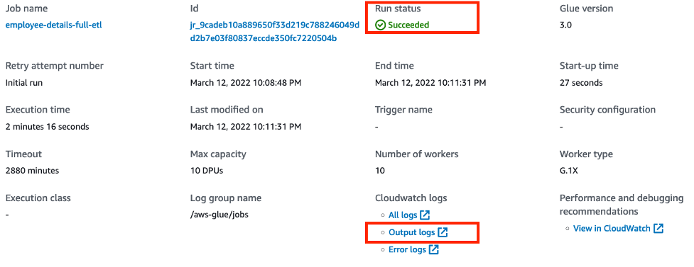 - Glue Job(Name : employee-details-cdc-etl)을 다시 실행하여 Glue Job Bookmark가 제대로 작동하는지 확인해 봅니다. Glue Job의 CloudWatch log(Output logs링크)를 확인하면, 두 번째 Glu Job 실행에서는 변경된 데이터가 없기 때문에 아무런 데이터도 처리되지 않을 것을 확인할 수 있습니다.