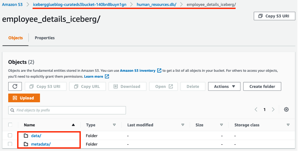 - Glue Job Parameter의 –iceberg_s3_path위치에서 Iceberg Table이 저장되어 있는 내용을 확인합니다. Apache Iceberg Format의 data와 metadata를 확인할 수 있습니다.