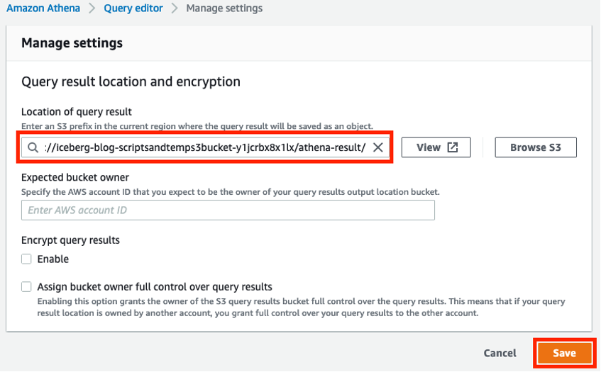 “Amazon Athena” -> “Query editor” -> “Settings”을 선택합니다.Location of query result에 “{ScriptsAndTempS3Bucket}/athena-result/”를 입력합니다. {ScriptsAndTempS3Bucket}는CloudFormation Output을 참조합니다. (반드시 맨 뒤에 “/”를 포함해야 합니다.)
