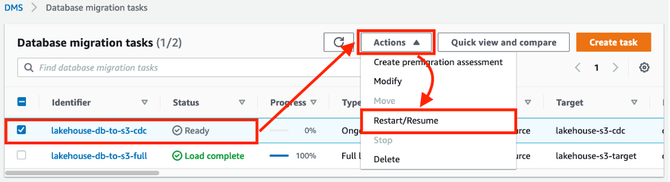 DMS -> Database migration tasks 메뉴에서 “lakehouse-db-to-s3-full” task를 선택하고, “Actions”에서 “Restart/Resume”을 선택합니다.Database migration task의 Status가 “Ready” -> “Starting” -> ”Running” -> ”Load complete”로 순차적으로 변경됩니다. 성공적으로 완료된 이후 Amazon S3에 “LOAD000….parquet” 파일이 생성된 것을 확인할 수 있습니다.