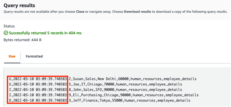 Source Database에 DML 을 수행한 이후, CDC task는 변경된 데이터를 자동으로 복제합니다. 파일명은 {RawS3Bucket}/cdc-load/human_resources/employee_details/yyyymmdd-…parquet로 생성됩니다.파일을 선택하고, “Action” -> “Query with S3 Select”로 파일의 내용을 확인합니다.