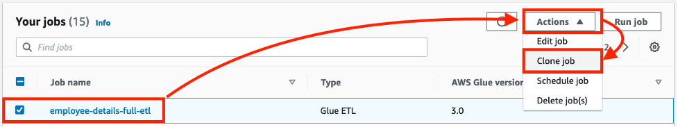 - “Run”을 선택하여 Glue Job을 실행합니다.