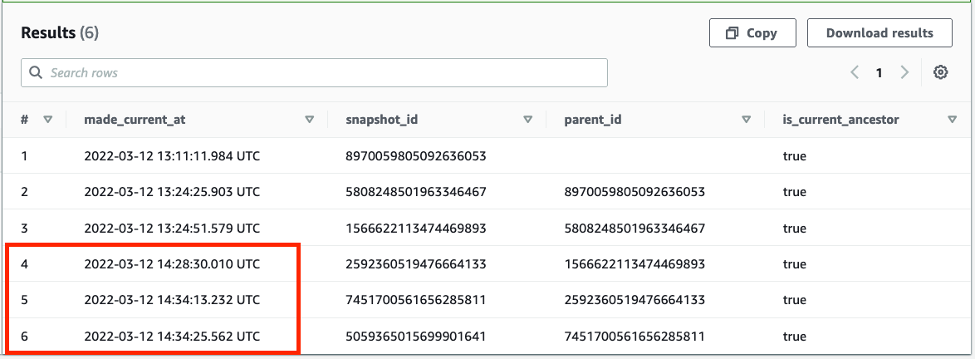 select * from human_resources.employee_details_iceberg FOR SYSTEM_TIME AS OF TIMESTAMP '2022-03-12 13:24:51.579 UTC'; select * from human_resources.employee_details_iceberg FOR SYSTEM_VERSION AS OF 1566622113474469893;이전에 삭제되었던 emp_no=6 데이터가 확인되는 것을 볼 수 있습니다. Iceberg Table의 Time-Travel 기능을 이용하면 사용자의 실수로 인한 데이터 삭제를 쉽게 복구할 수 있습니다.