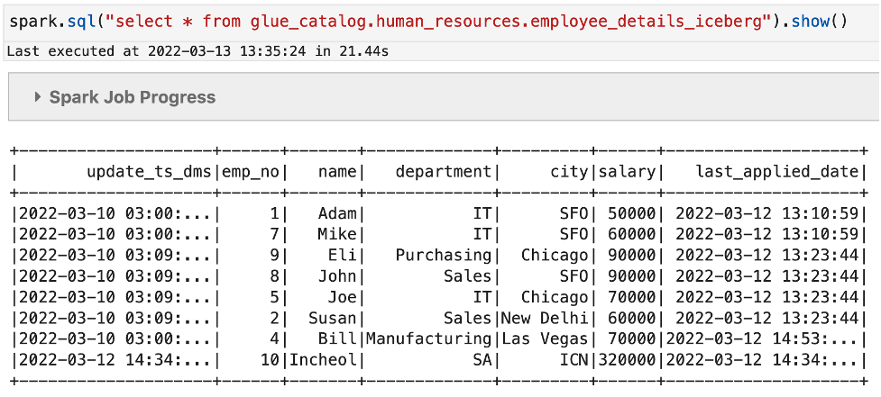 select * from "human_resources"."employee_details_iceberg" limit 10;“last_applied_date” 컬럼에는 Iceberg Table에 데이터가 저장된 시간이 표시됩니다.