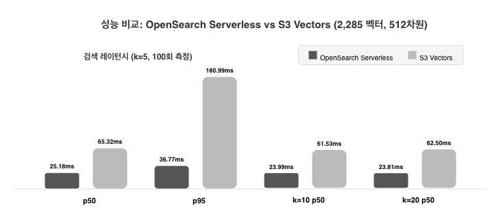 배치 크기와 인제스트 방식이 성능에 주는 영향: S3 Vectors의 경우 배치 크기를 50에서 500(API 최대값)으로 변경하는 것만으로 인제스트 시간이 약 3배 개선되었습니다. 각 서비스의 API가 허용하는 최대 배치 크기를 활용하는 것이 중요합니다.