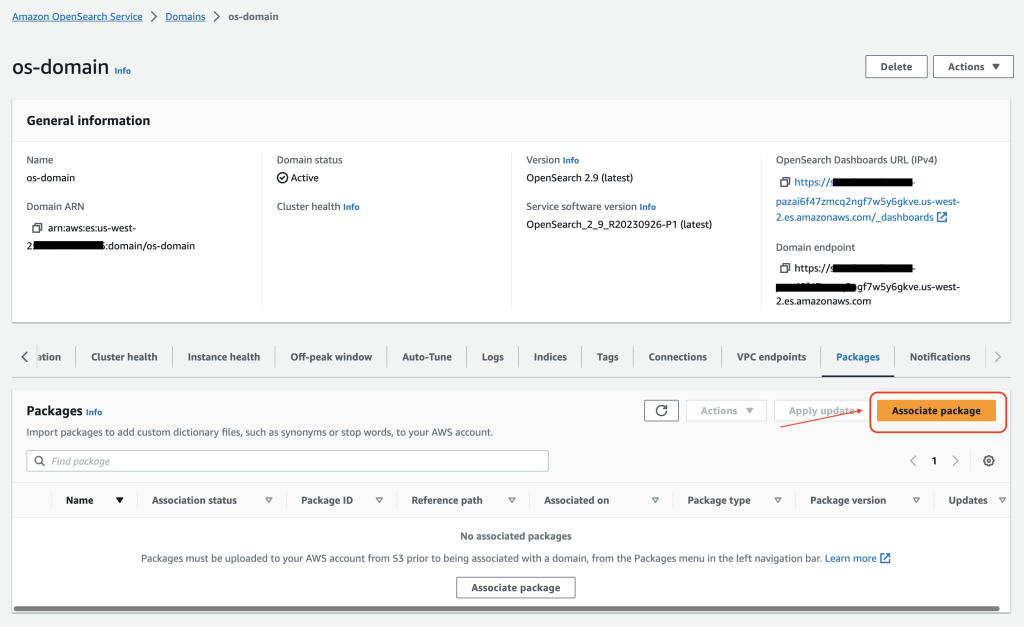 - Packages(패키지) 탭에서 Associate package(패키지 연결)을 선택하여 Amazon Personalize 검색 순위 플러그인을 OpenSearch Service 도메인에 연결합니다. 플러그인 버전은 OpenSearch Service 도메인 버전과 일치해야 합니다.