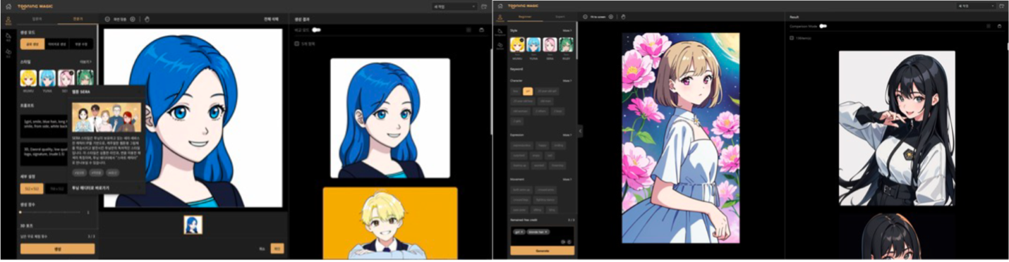 툰스퀘어 (Toonsquare)는 웹 브라우저 기반의 서비스형 소프트웨어(SaaS) AI 인공지능 웹툰 창작 플랫폼인 ‘투닝(Tooning)’ 서비스를 제공하는 플랫폼입니다. 디지털 창작에 최적화된 핵심 AI 기술을 적용하여 투닝 매직AI, 에디터, 월드 서비스 등을 운영하며 창작 문화를 만들고 혁신을 이뤄내고 있습니다. 특히 투닝 매직 AI를 통해 사용자가 프롬프트를 클릭하거나 직접 입력하여 고해상도의 이미지를 생성할 수 있는 고퀄리티 이미지 창작 서비스를 제공하고 있습니다.