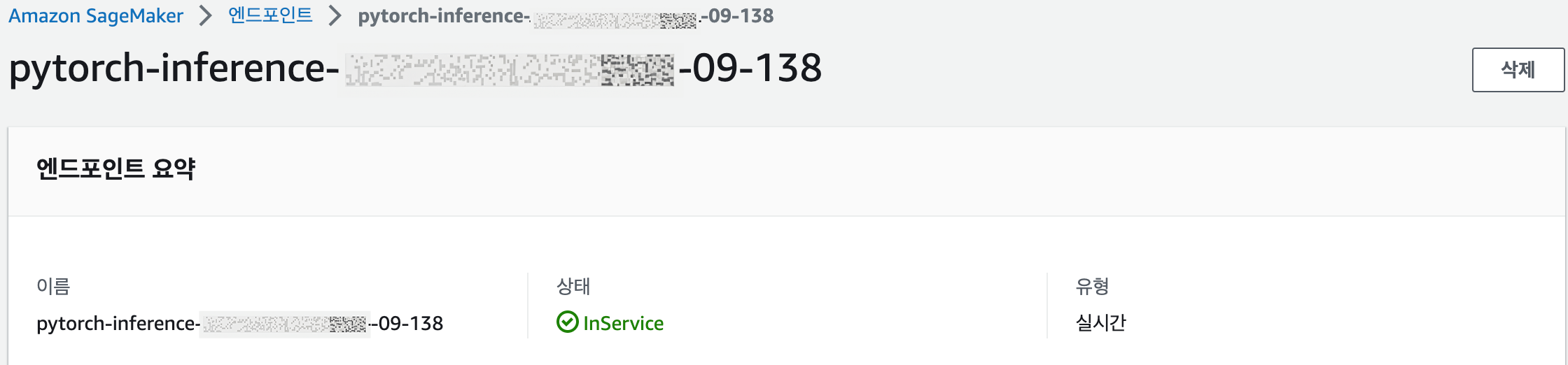 위와 같이 모델을 배포하면, 콘솔을 통해 SageMaker 엔드포인트가 생성된 것을 확인할 수 있습니다.