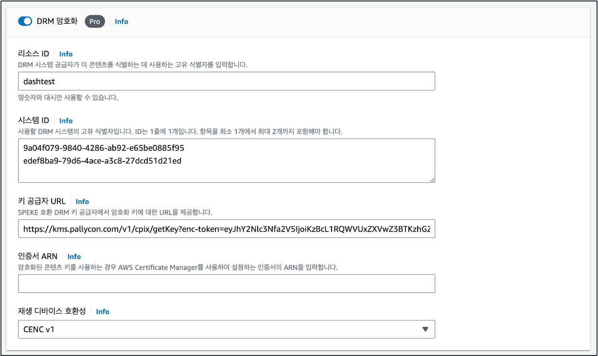 DRM 암호화를 활성화하고 Resource ID, System ID, URL를 입력합니다.