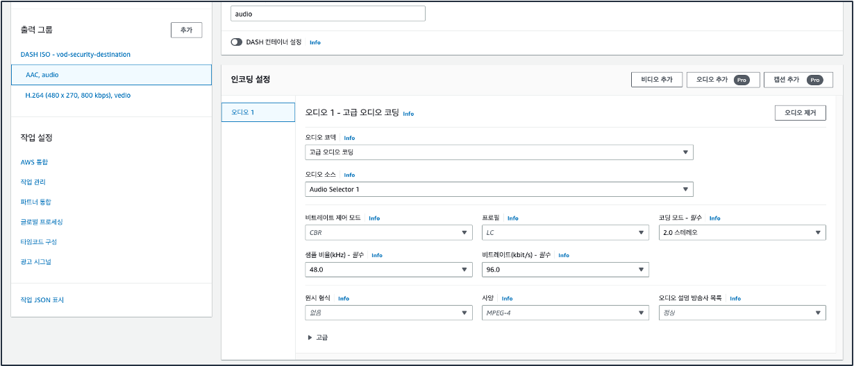 그리고 DASH ISO 그룹 설정에서 사용자 지정 그룹 이름에는 사용자가 구분하기 편한 이름을 입력합니다. 예: vod-security-destination