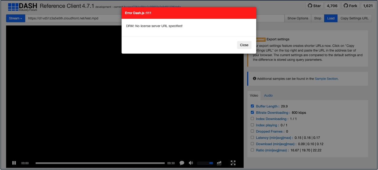 생성 버튼을 클릭한 후, S3 타겟 버킷에 접속하면 트랜스코딩된 파일이 생성된 것을 확인할 수 있습니다. 다음은 Dash Player에 접속하여 Cloudfront의 도메인 주소를 입력하면 다음과 같이 DRM no license error 오류 메시지가 발생하는 것을 확인할 수 있습니다. 예 : https://d1vd51z3a5e5th.cloudfront.net/test.mpd
