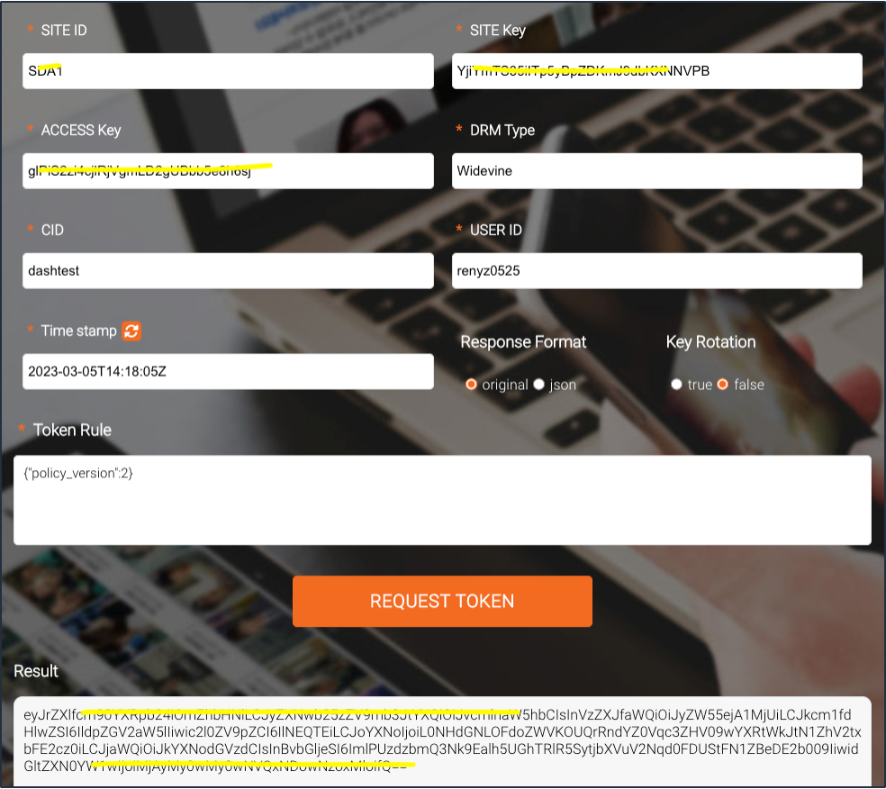 UserID로는 임의의 사용자 정보를 입력하고 Time stamp는 현재 시간으로 싱크업하고 request token 버튼을 클릭하면 Token 값을 확인할 수 있습니다.