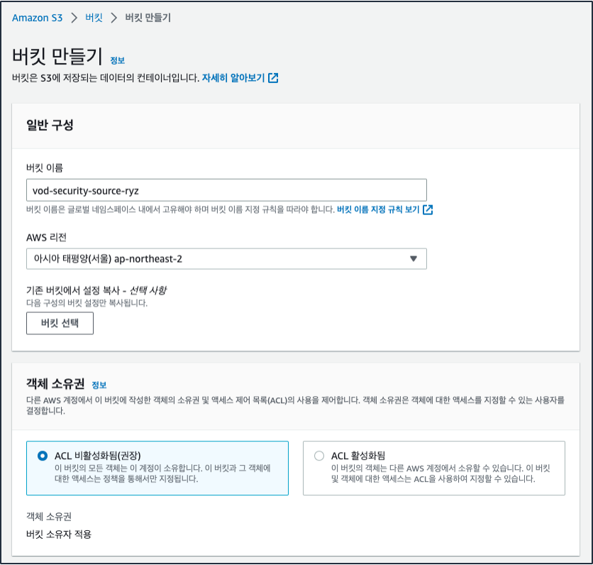 S3 콘솔에 접속하여 소스 및 타겟 버킷 두 개를 생성합니다. 해당 예시에서는 소스 버킷 이름으로 vod-security-source-xxx를 입력했고, 타겟 버킷 이름은 vod-security-destination-xxx 으로 지정했습니다.