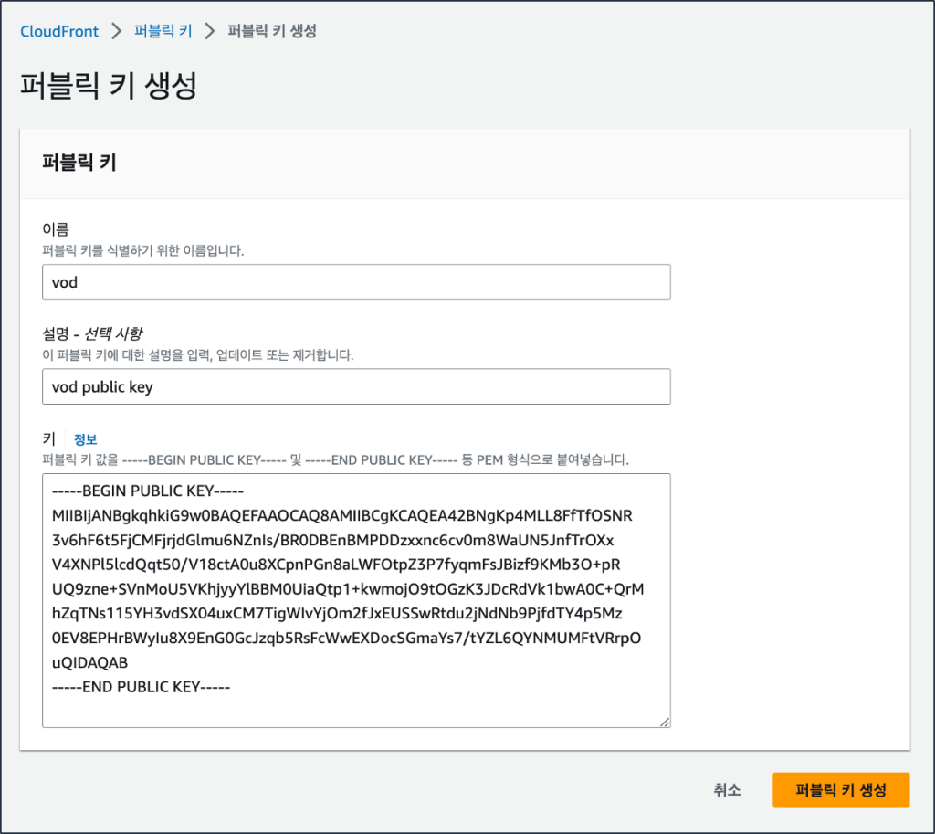 이전 단계에서 생성한 vod 퍼블릭 키를 기반으로 다음과 같이 키 그룹을 생성합니다. 이 키 그룹은 뷰어 액세스 제한에 사용될 예정입니다.