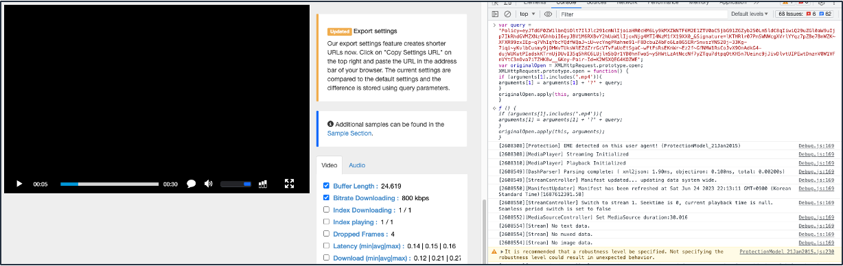 해당 소스를 기반으로 CloudFront에 요청하는 m3u8 및 ts 파일에 대해서 쿼리 스트링을 추가하여 Signed URL로 변환하면 정상적으로 프라이빗 콘텐츠가 재생되는 것을 확인할 수 있습니다.