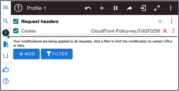 또 다른 방법으로는 클라이언트에 쿠키를 사용하고 플레이어는 쿠키를 가지고 콘텐츠를 요청할 수가 있습니다. Signed Cookies는 다음과 같은 세 가지로 구성됩니다. CloudFront-Policy, CloudFront-Signature, CloudFront-Key-Pair-Id입니다. 크롬 브라우저에서 header 정보를 강제적으로 설정하기 위해서 크롬의 ModHeaher 플러그인을 설치 합니다. 해당 플러그인을 설치하면 우측상단 도구모음에 아이콘이 생기고 Request Header 를 지정할 수 있습니다.