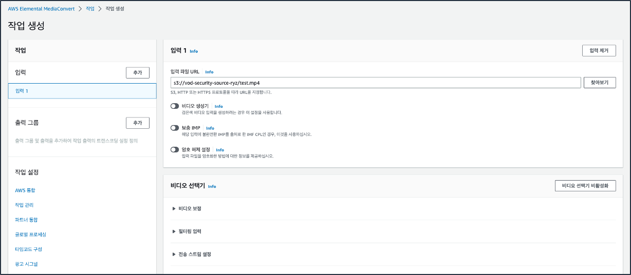 AWS Elemental MediaConvert 콘솔로 이동합니다. 작업 생성 버튼을 클릭하고 입력은 소스 버킷에 업로드한 test 영상 파일 (임의의 영상을 업로드하면 되기에 해당 블로그에서 출처를 명시하지 않았습니다.)을 선택합니다.