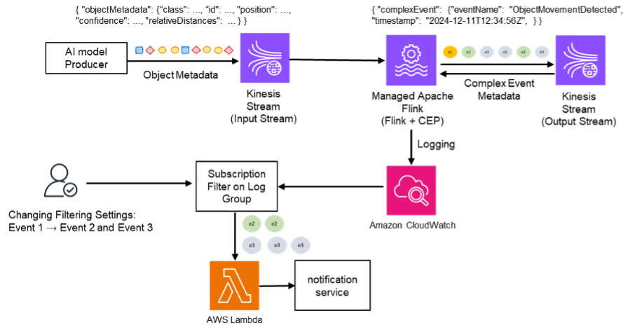 Managed Apache Flink에 배포된 스트리밍 애플리케이션에는 간단한 하위 이벤트부터 이벤트 간 관계를 통해 도출되는 상위 이벤트까지 검출할 수 있는 로직을 포함하고 있습니다. 장소나 상황에 따라 Flink App의 로직을 변경하여 신규, 재배포가 가능했습니다.