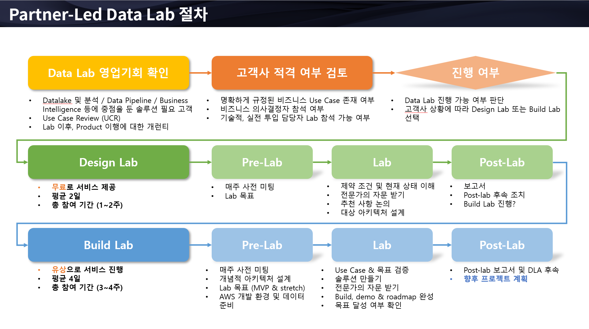 Partner-Led Data Lab has two services: Build Lab and Design Lab. Build Lab is a 3-5 day intensive build program with a technical customer team. Design Lab is a 1-2 day aligned program for customers who are not yet ready to build and need real-world architecture recommendations from AWS experts. Both engagements are hosted at an in-person AWS Data Lab hub or MegazoneCloud hub.