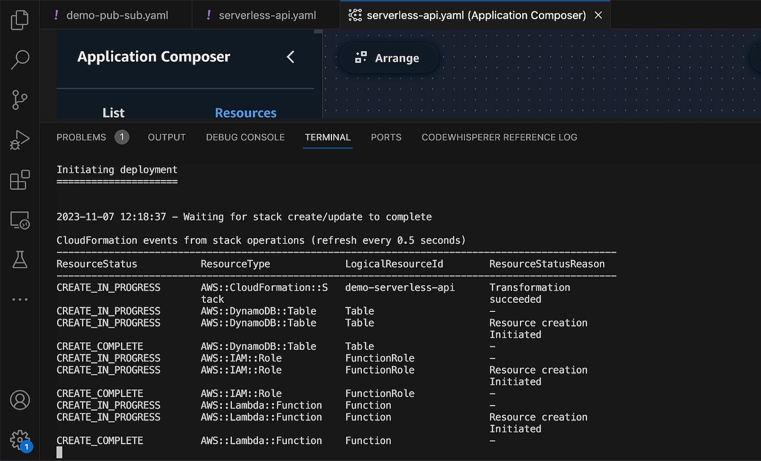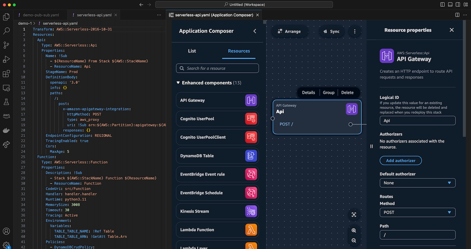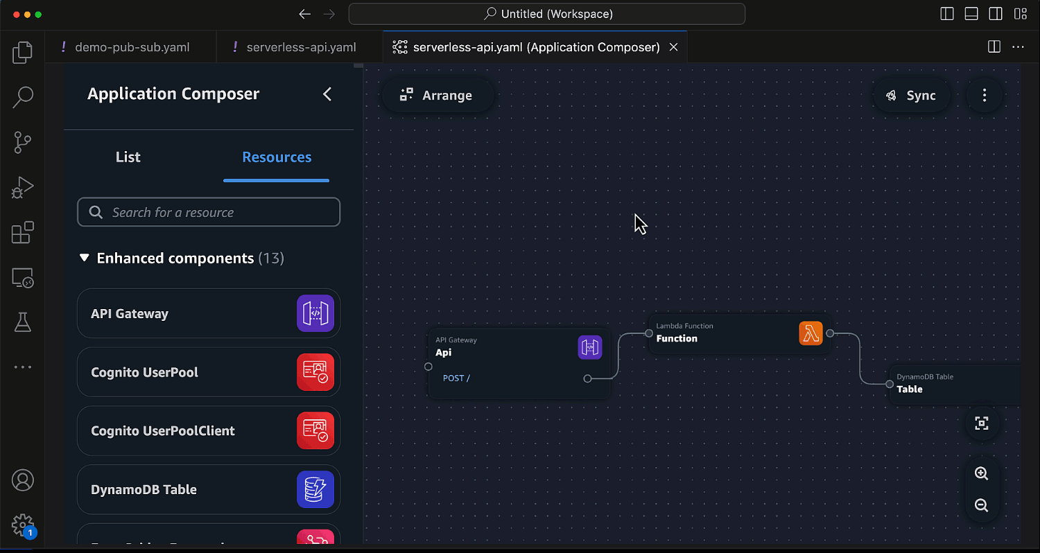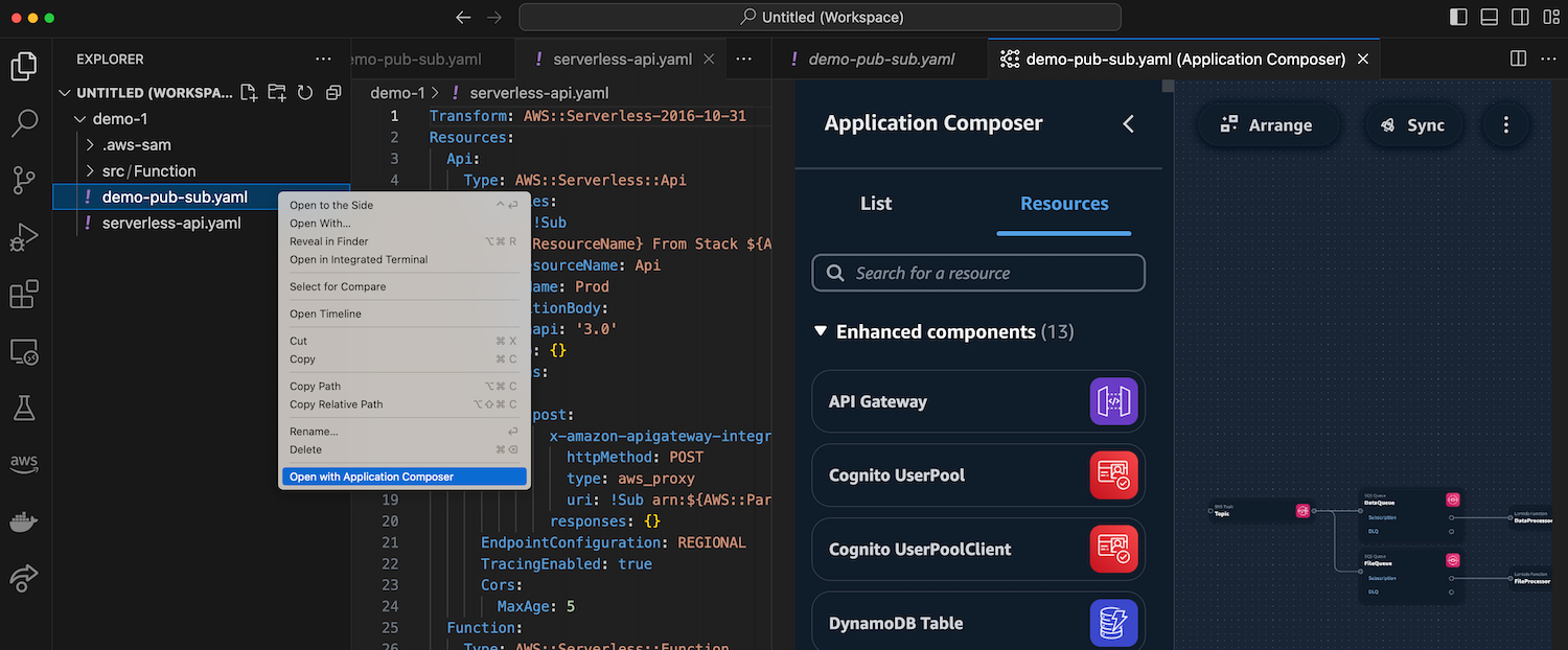 Com o Application Composer em execução no seu IDE, você também pode usar as várias ferramentas disponíveis no seu IDE. Por exemplo, você pode integrar perfeitamente modelos de IaC gerados em tempo real pelo Application Composer com o AWS Serverless Application Model (AWS SAM) para gerenciar e implantar seus aplicativos serverless (sem servidor).