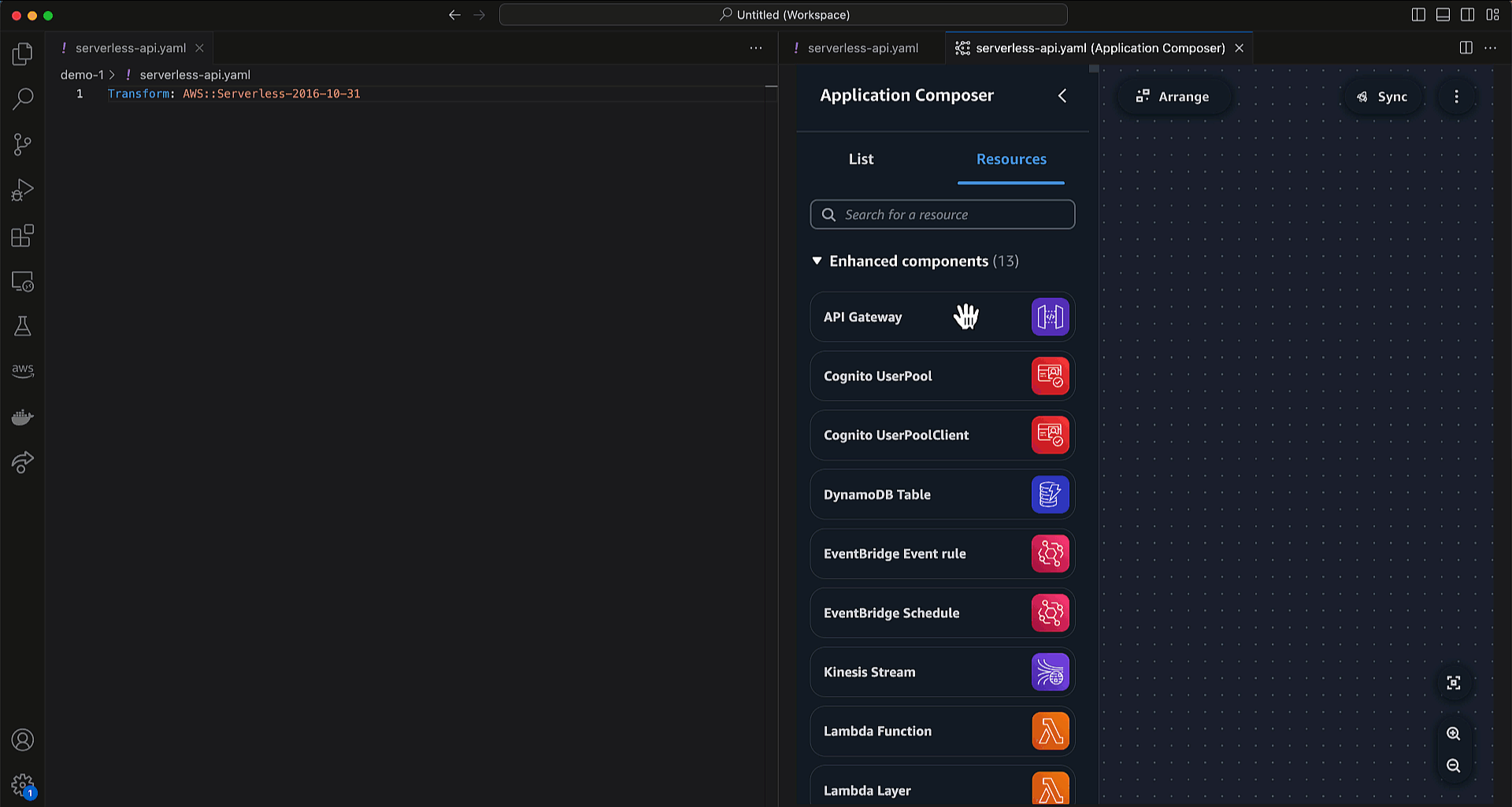 Isso fornecerá uma tela em branco. Aqui, temos editores visuais e de código ao mesmo tempo, para criar uma API simples, serverless, usando o Amazon API Gateway, o AWS Lambda e o Amazon DynamoDB. Todas as alterações que fizermos na tela também serão refletidas em tempo real no modelo IaC.