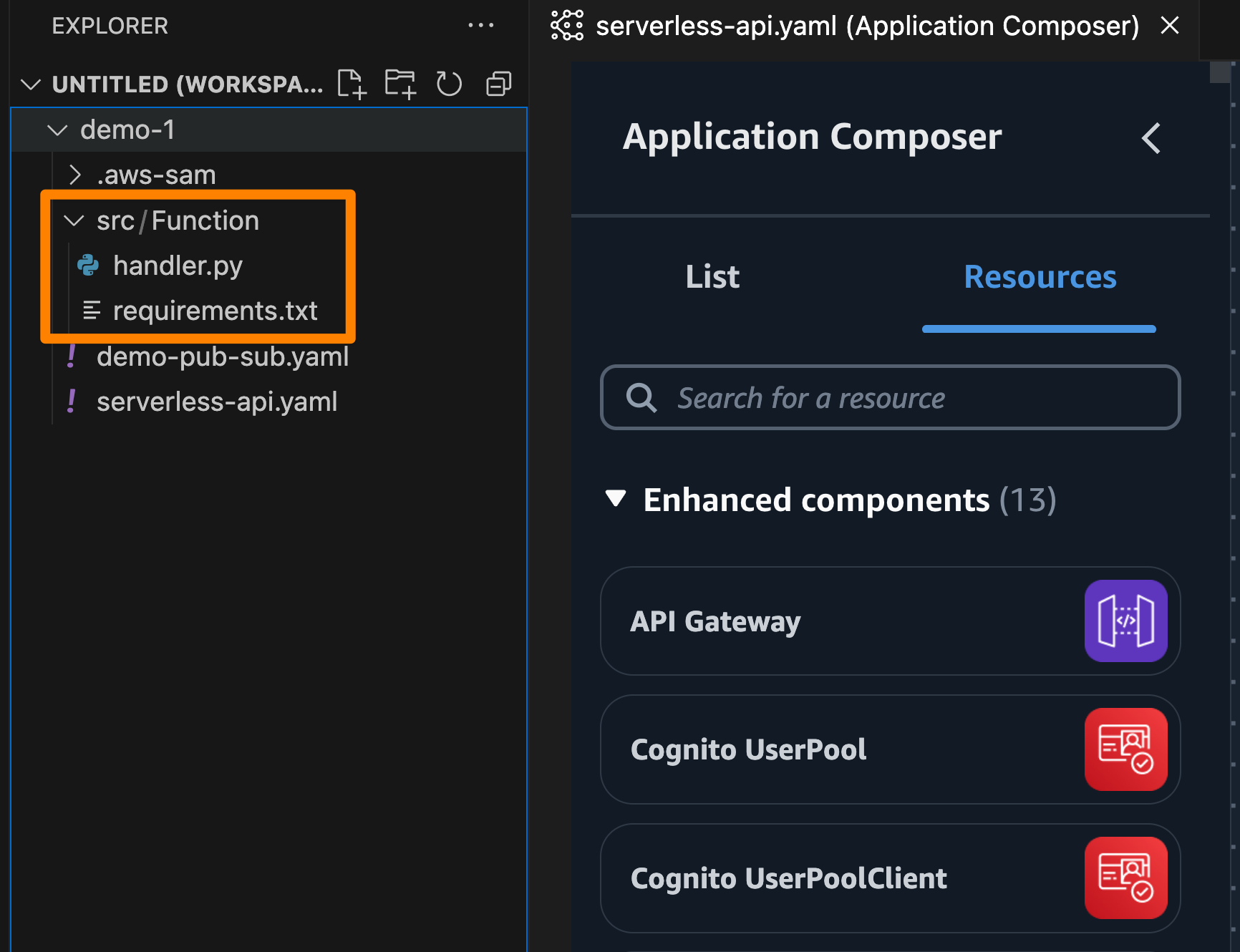 Conseguimos experiências consistentes, semelhante ao uso da console do Application Composer. Por exemplo, se fizermos algumas modificações na função do AWS Lambda, ela também criará arquivos relevantes na pasta local.
