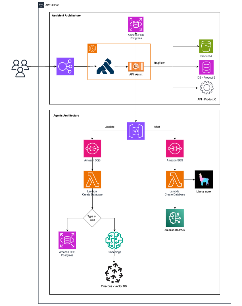• Amazon RDS (PostgreSQL): O banco de dados PostgreSQL, rodando no Amazon RDS, permite que todas as consultas realizadas pelos assistentes sejam tratadas de forma rápida e segura. O RDS cuida do gerenciamento de backups, segurança e failover, garantindo que os dados dos assistentes estejam sempre disponíveis.